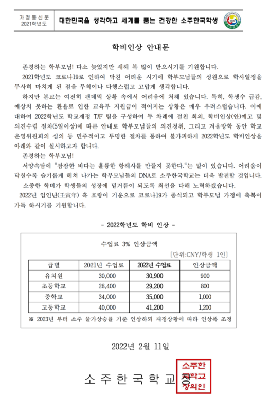 ¼ÒÁÖÇѱ¹Çб³ 2022Çг⵵ ÇкñÀλó ¾È³» °¡Á¤Åë½Å¹®
