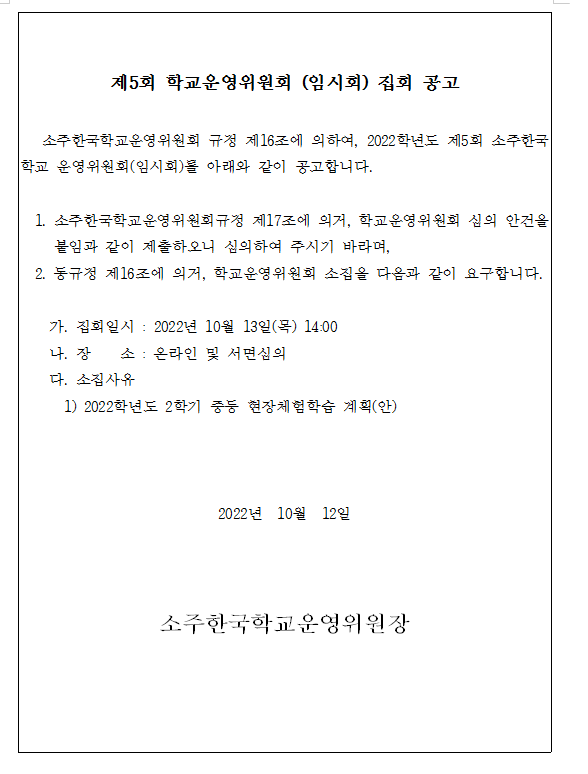 2022Çг⵵ Á¦5ȸ Çб³¿î¿µÀ§¿øÈ¸(ÀÓ½Ãȸ) Áýȸ °ø°í
