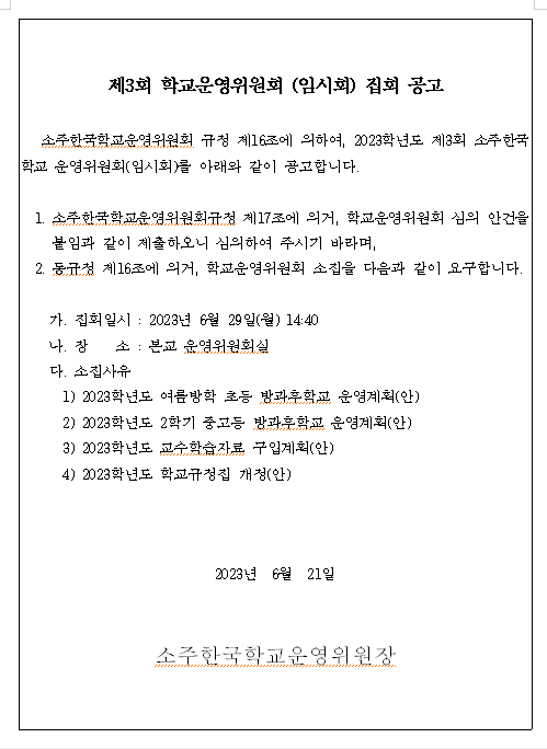 2023Çг⵵ Á¦3ȸ Çб³¿î¿µÀ§¿øÈ¸(ÀÓ½Ãȸ) Áýȸ °ø°í
