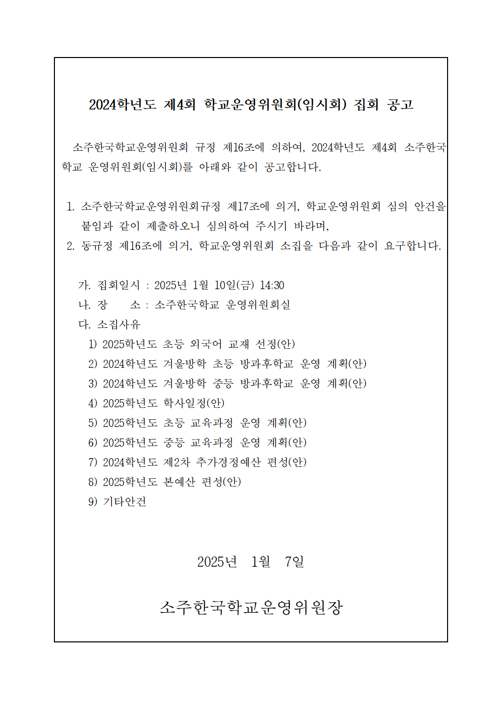 2024Çг⵵ Á¦4ȸ Çб³¿î¿µÀ§¿øÈ¸(ÀÓ½Ãȸ) Áýȸ °ø°í