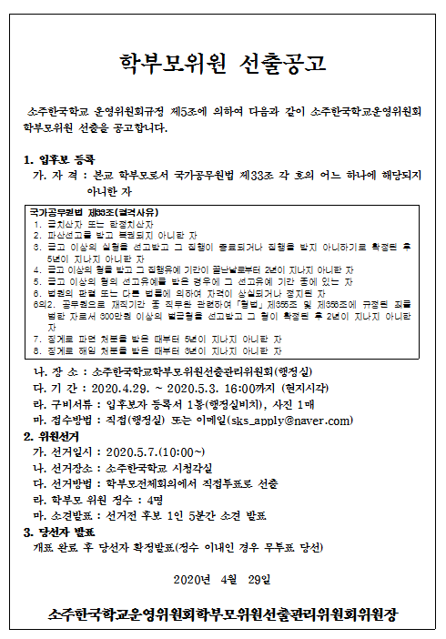 Á¦6±â ¼ÒÁÖÇѱ¹Çб³ ÇкθðÀ§¿ø ¼±Ãâ°ø°í